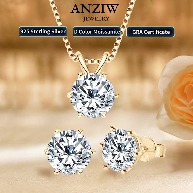 Introducing Anziw's 18K Gold Plated Jewelry Set - a timeless and elegant choice for any occasion. Made with real 925 silver and featuring a stunning 3.0ctw D color Moissanite, this set exudes sophistication and glamour. Its extremely durable, 6-prong setting ensures long-lasting wear for both men and women. Comes with a GRA certificate and gift box.