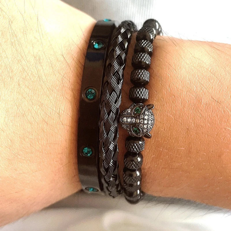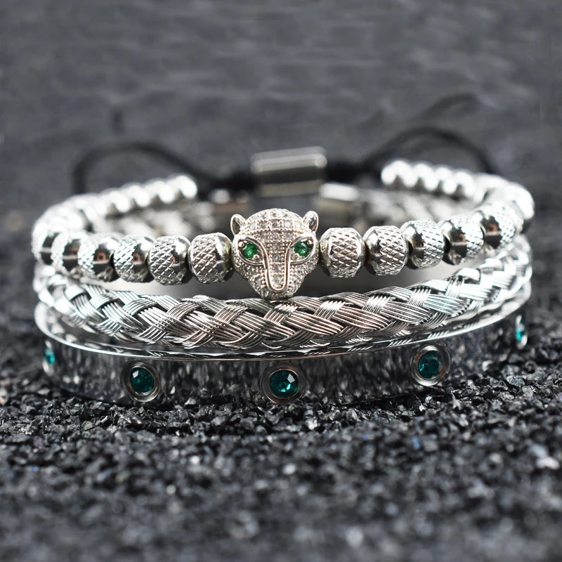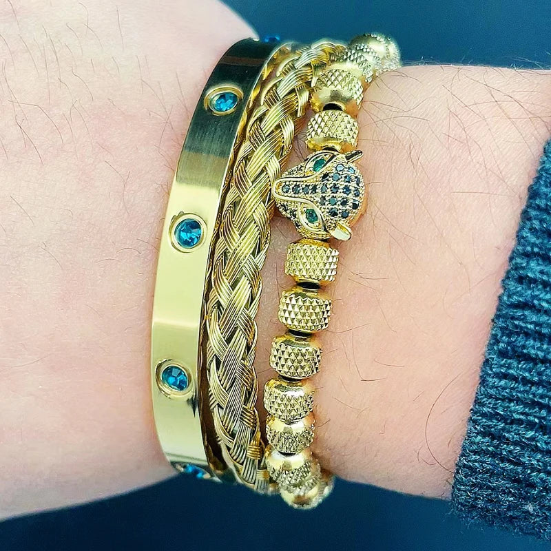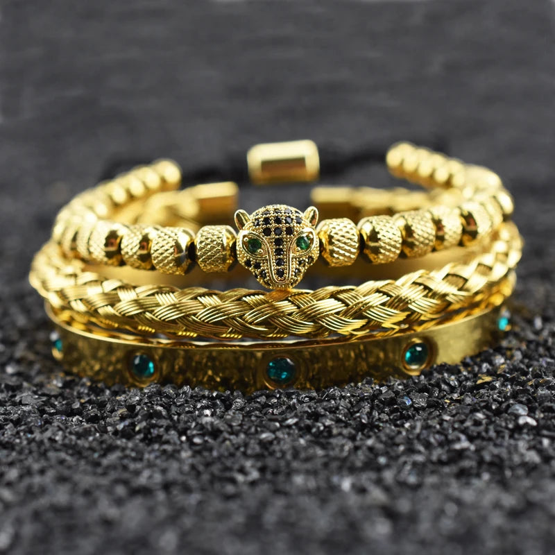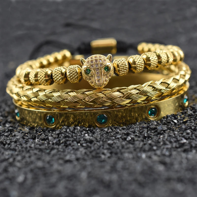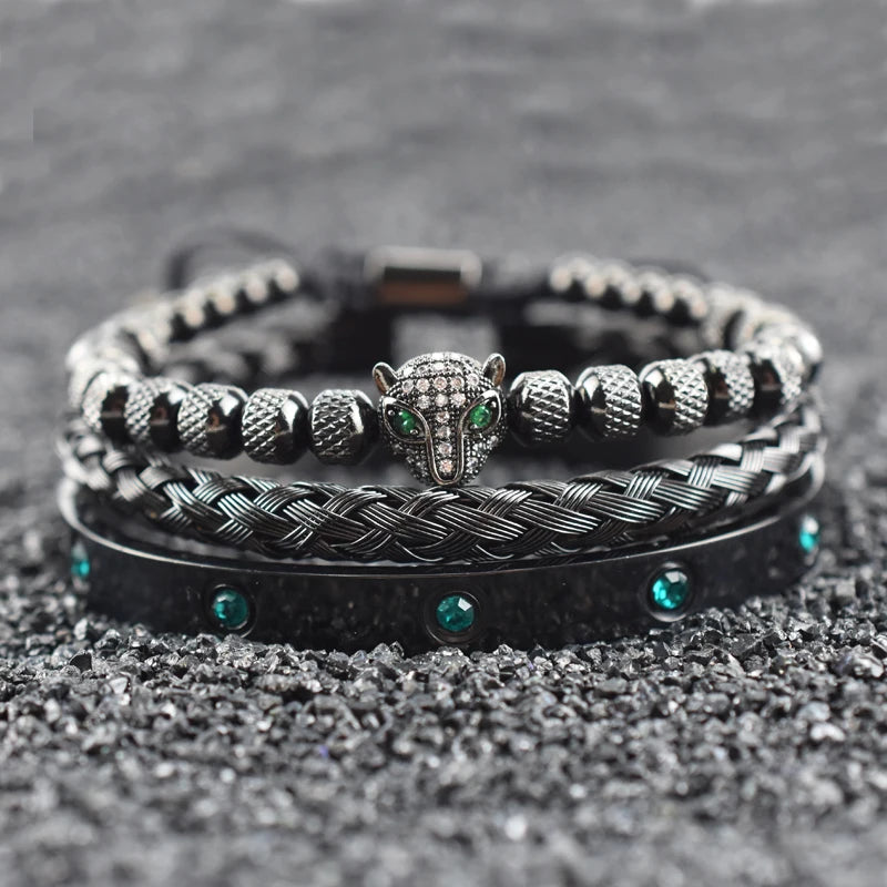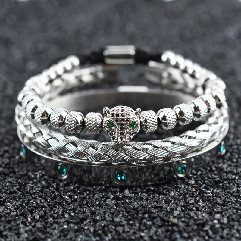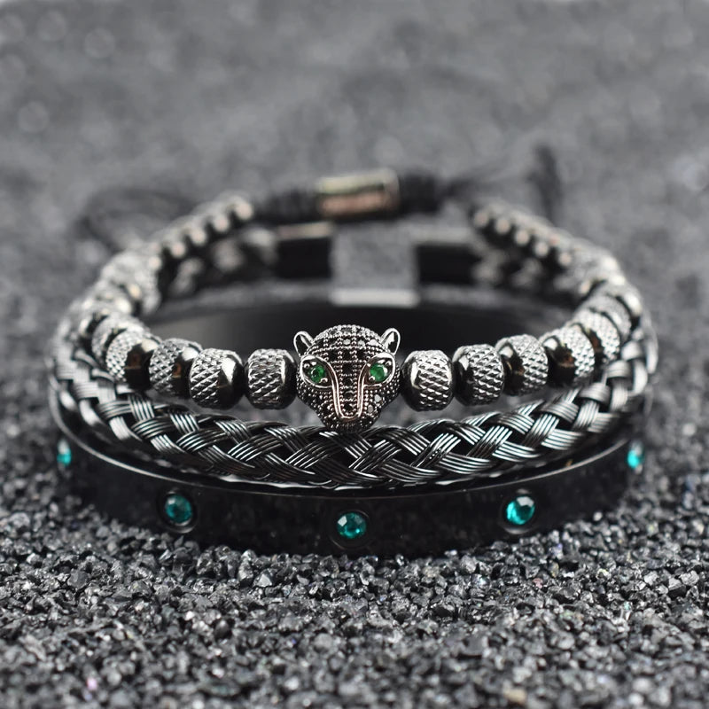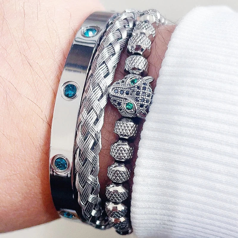 Luxury Set Green Eye Leopard Head Charm Handmade Unisex Bracelet Crystals Stainless Steel Bangles Jewelry